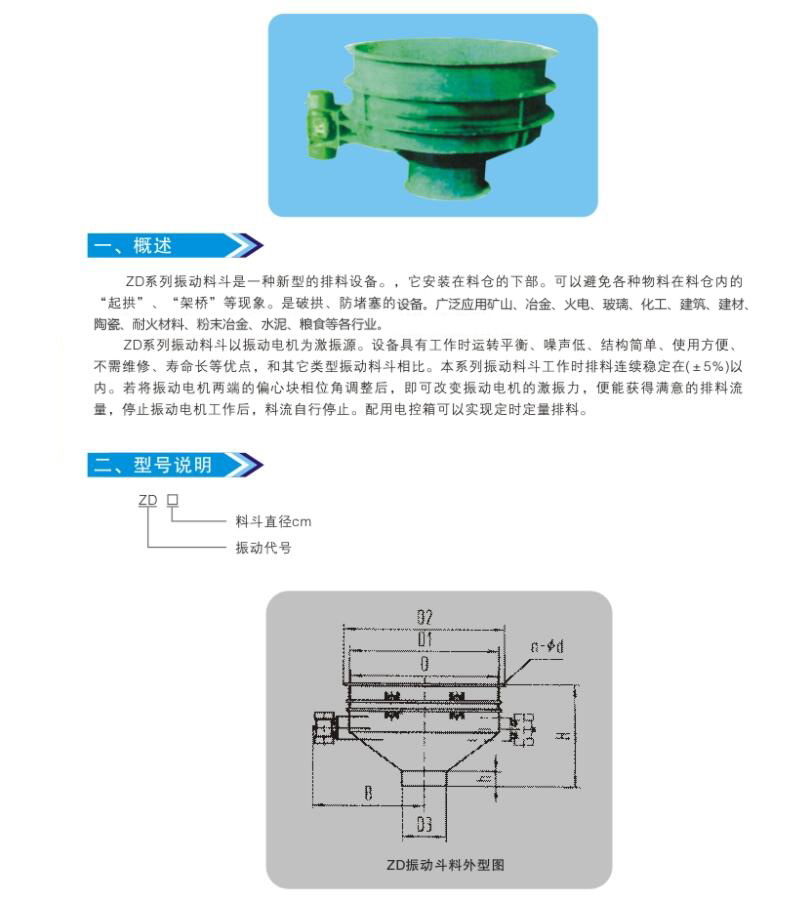 ZD系列振动料斗是一种新型的排料设备。,它安装在料仓的下部。可以避免各种物料在料仓内的“起拱”、“架桥”等现象。是破拱、防堵塞的有效设备。广泛应用矿山、冶金、火电、玻璃、化工、建筑、建材、陶瓷、耐火材料、粉末冶金、水泥、粮食等各行业。